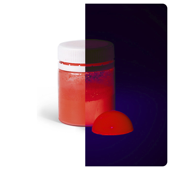 Флуоресцентный пигмент порошковый окрашивает эпоксидную смолу в выбранный оттенок и обладает высокой красящей способностью. Изделиям из смолы с флуоресцентным пигментом характерен эффект светоотражения. Излучение света происходит только когда предмет испытывает воздействие источника света, в частности УФ-излучения. Продукт способен передавать свои качества не только эпоксидке, но и пластику, силикону, различным краскам.
