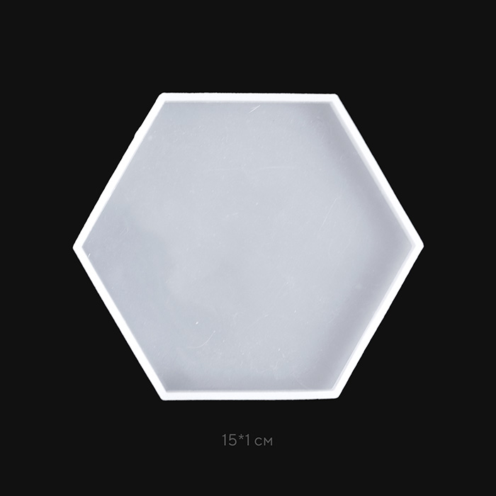 Изделие из эпоксидной смолы в форме многоугольника может использоваться в качестве подстаканника или чаши для бижутерии, а так же быть элементом декора. Для заливки изделия из смолы можно выбрать два варианта гексагона по размеру: 150 мм и 75 мм. Толщина полученного украшения составит 10 мм.