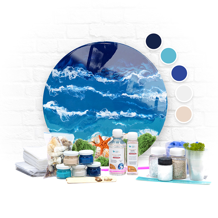 Самая популярная тематика в технике Resin Art — создание морского панно, которое украсит любой интерьер, напомнит о теплых летних днях или долгожданном отпуске. Благодаря легкости работы, изобразить такой пейзаж самостоятельно может каждый, а для простоты и творческого настроя идеально подойдет большой комплект от Artline, в котором есть всё, что вам необходимо для вашей картины.