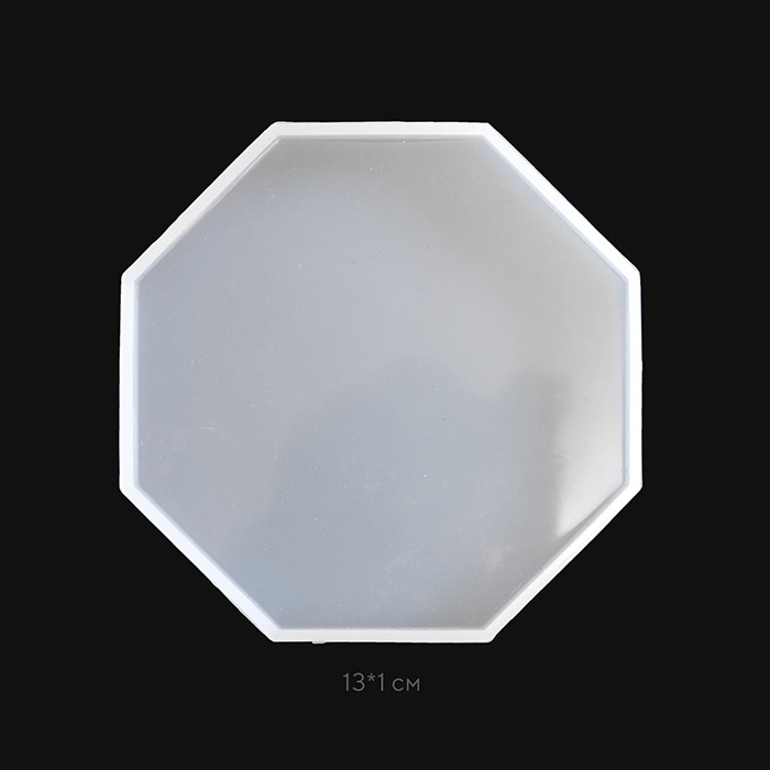 Изделие из эпоксидной смолы в форме октагона (восьмиугольник) может использоваться в качестве подстаканника или чаши для бижутерии, а так же быть элементом декора. Для заливки изделия из смолы можно выбрать два варианта октагона по размеру: 130 мм и 75 мм. Толщина полученного украшения составит 10 мм.