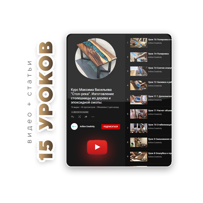 Авторский видео-курс от нашего друга-специалиста по эпоксидной смоле и деревообработке Максима Васильева. Пошаговая инструкция от выбора проекта до финишного покрытия. Демонстрация работы на деревообрабатывающих станках. Рекомендации, секреты, лайфхаки, все, что нужно для создания шедевра собственными руками. Дарите идеям жизнь!
